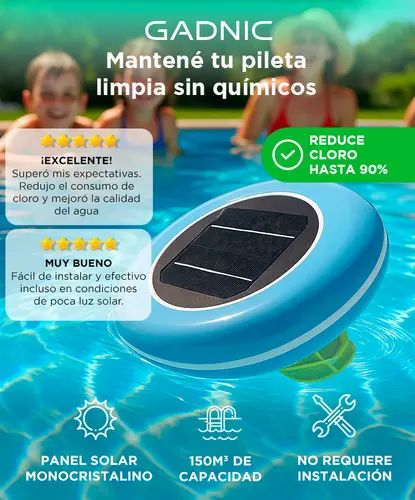 Ionizador solar con luz RGB, Anti sarro sustentable para piscinas de hasta 130 mil litros. Reduce algas, bacterias y sarro de forma sustentable y sin químicos. Funciona con panel solar