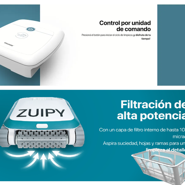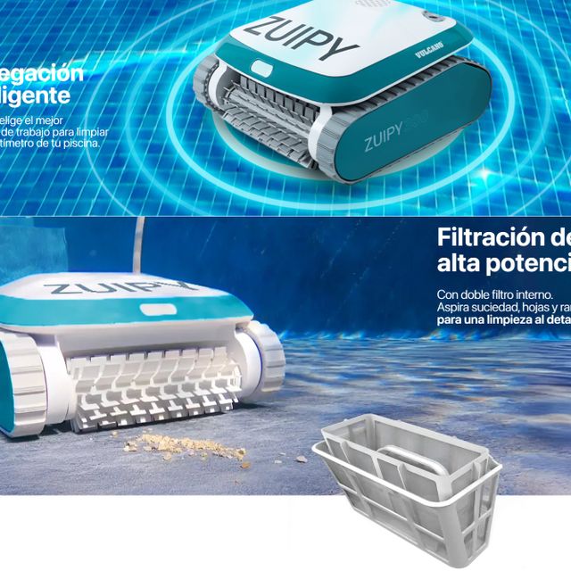 Liviano, moderno y con navegación inteligente, ZUIPY se mueve con precisión para dejar tu piscina impecable. Su potente filtrado elimina la suciedad y su tecnología se adapta a cualquier superficie.