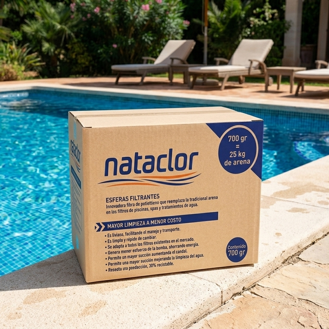 Pompones filtrantes hechos de fibra de poliéster que reemplaza la tradicional arena/grava en los filtros de piscinas. Una caja de 700grs equivalen a 25kg de arena. Requieren mayor mantenimiento.